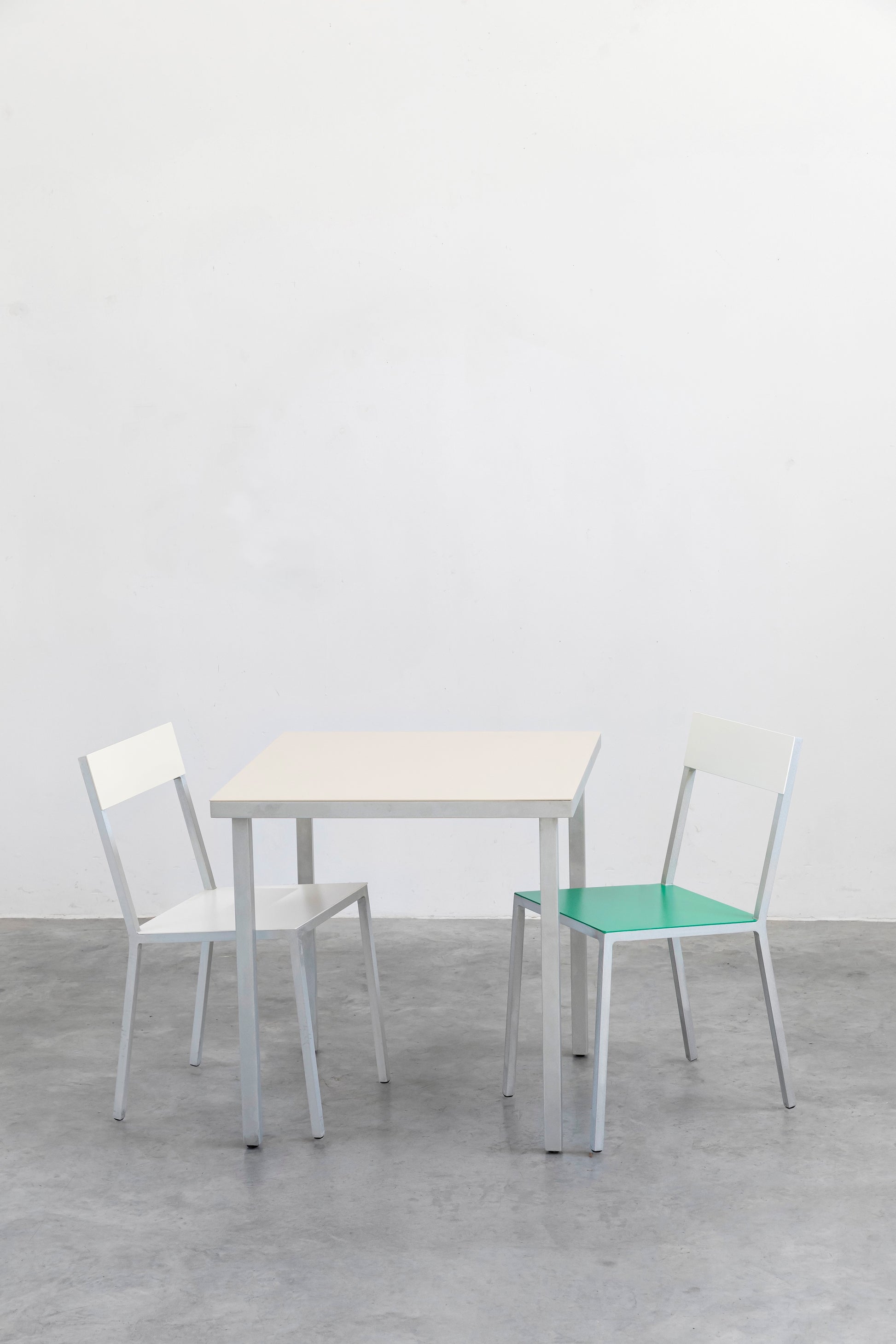 Alu dining table S is a continuation of the alu chair. This light weight table comes in three sizes: S, M and L. Like the alu chair, the alu dining table consists of a light aluminium frame and a thickly lacquered surface, allowing the layer of color to become a material on its own.