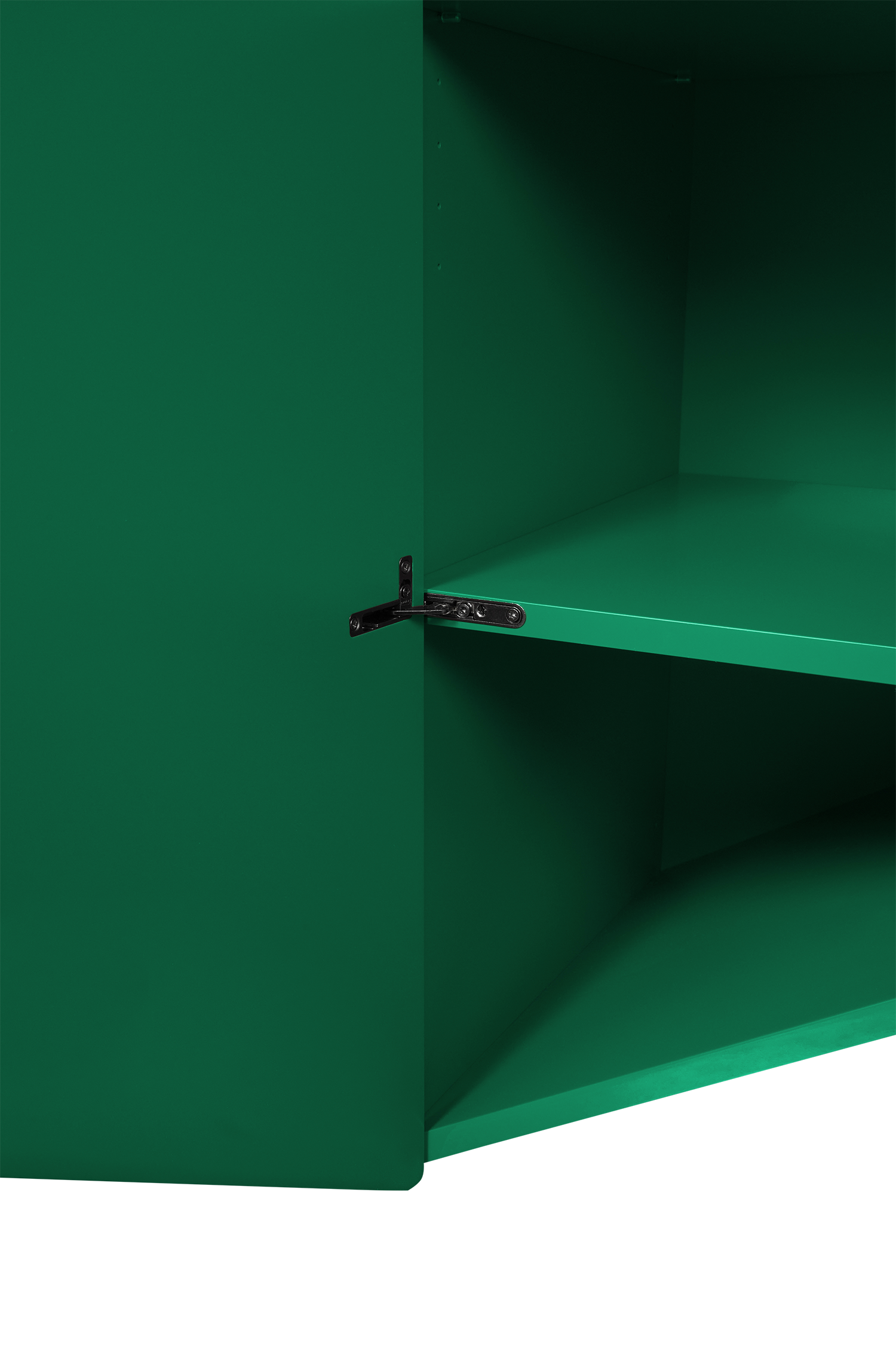 The containers, shelves and doors are made of MDF and high gloss lacquered in four different colors. The interiors are always lacquered in matt finish. Regulation glides are included in order to fit the different floors. The doors have steel hidden hinges finished in titanium and installed with an automatic pulse opening spring system. A coat bar for clothes is an extra accessory for the large version of the cabinet.