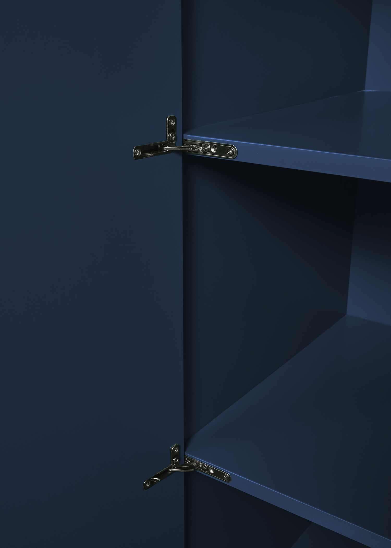 The containers, shelves and doors are made of MDF and high gloss lacquered in four different colors. The interiors are always lacquered in matt finish. Regulation glides are included in order to fit the different floors. The doors have steel hidden hinges finished in titanium and installed with an automatic pulse opening spring system. A coat bar for clothes is an extra accessory for the large version of the cabinet.