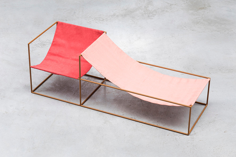This double seat is crafted from a mustard lacquered steel frame and features two linen seats in either pink/red or light blue/green, sewn to the frame.
