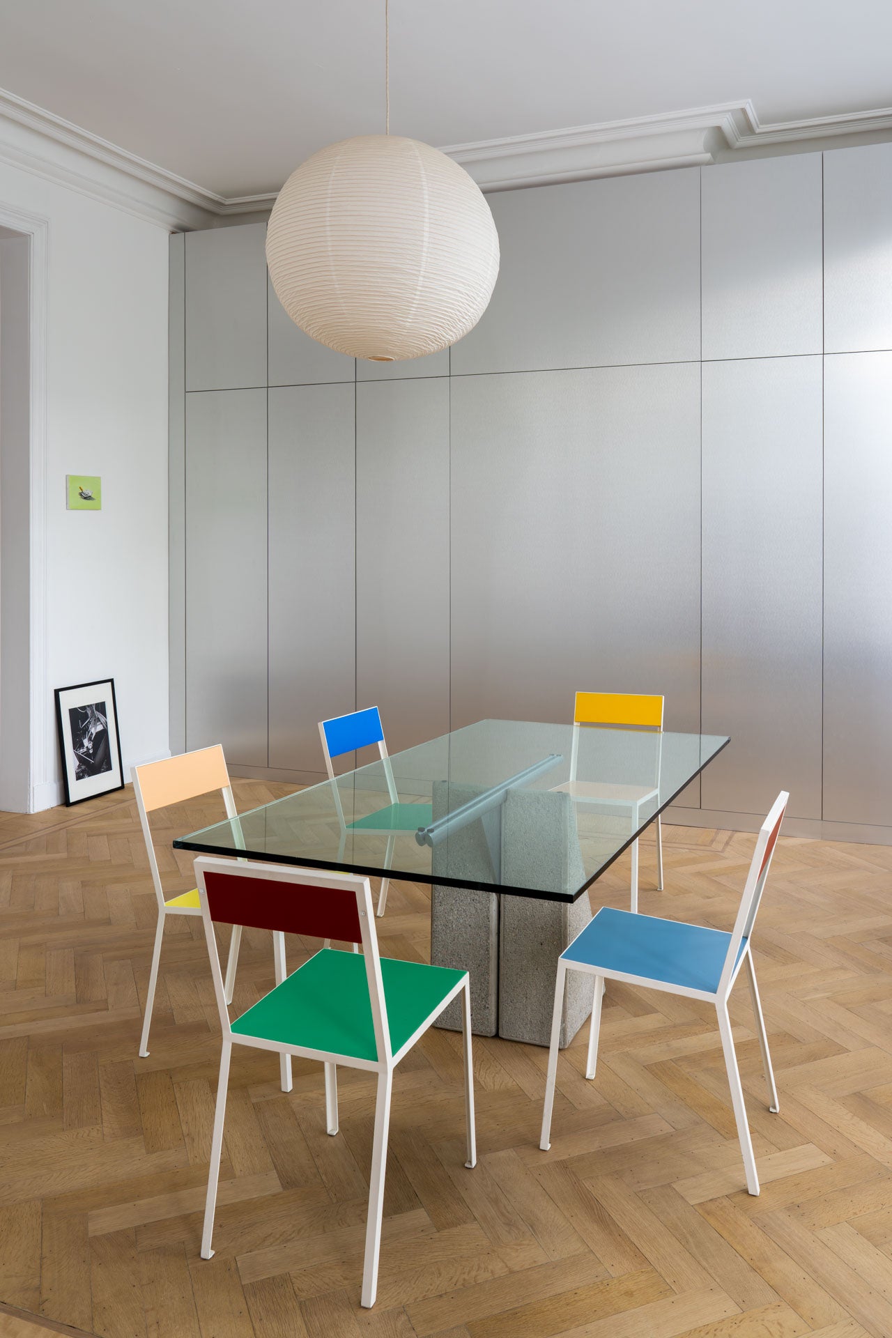 A white lacquered L-shaped steel frame is combined with colorful polyethylene for the back and seat. The seating is positioned in a slight downward slope, creating a comfortable angle for sitting. It's available in a variation of color combinations.