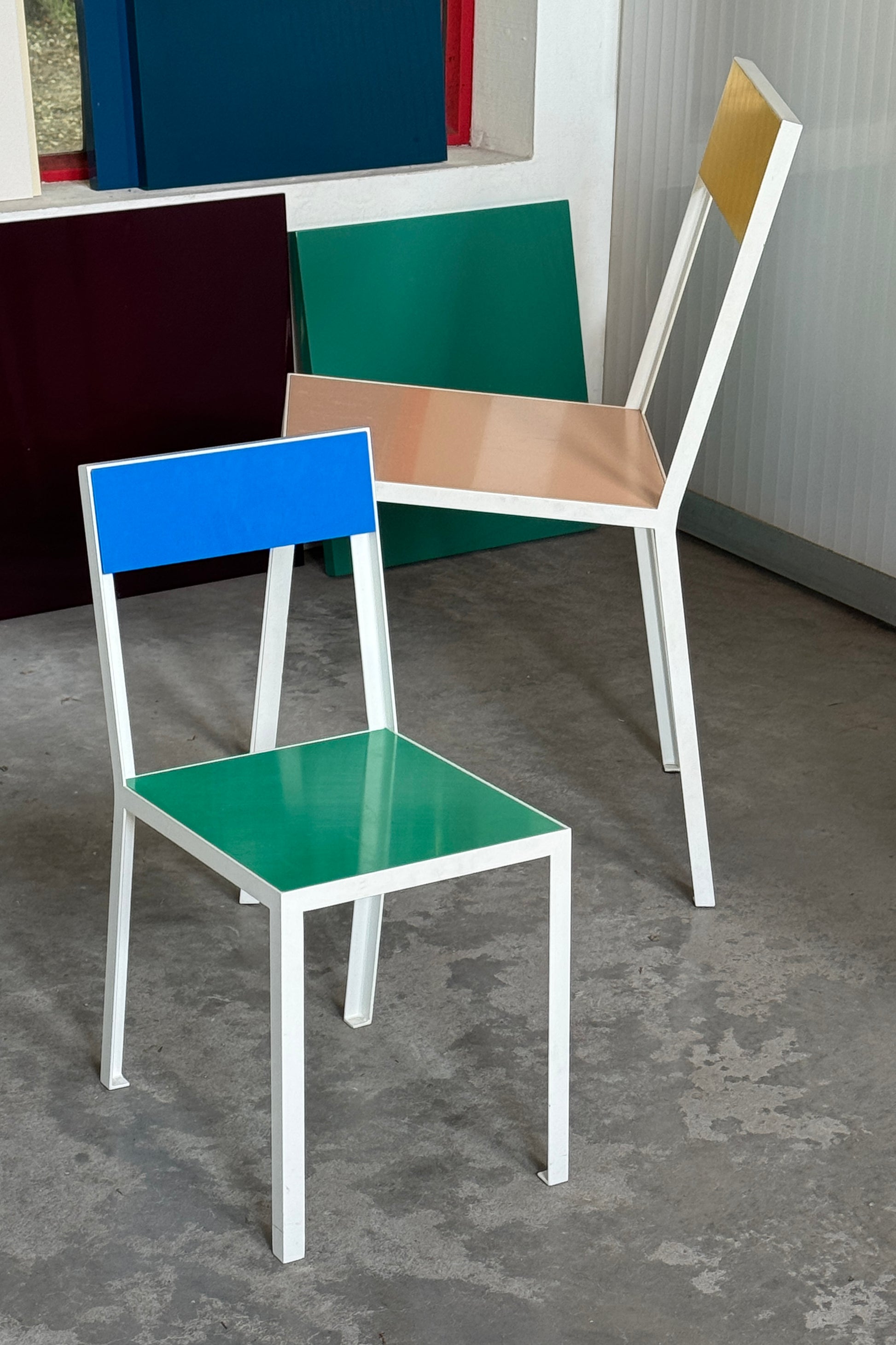 A white lacquered L-shaped steel frame is combined with colorful polyethylene plastic for the back and seat. The seating is positioned in a slight downward slope, creating a comfortable angle for sitting. It is offered in a variation of color combinations.