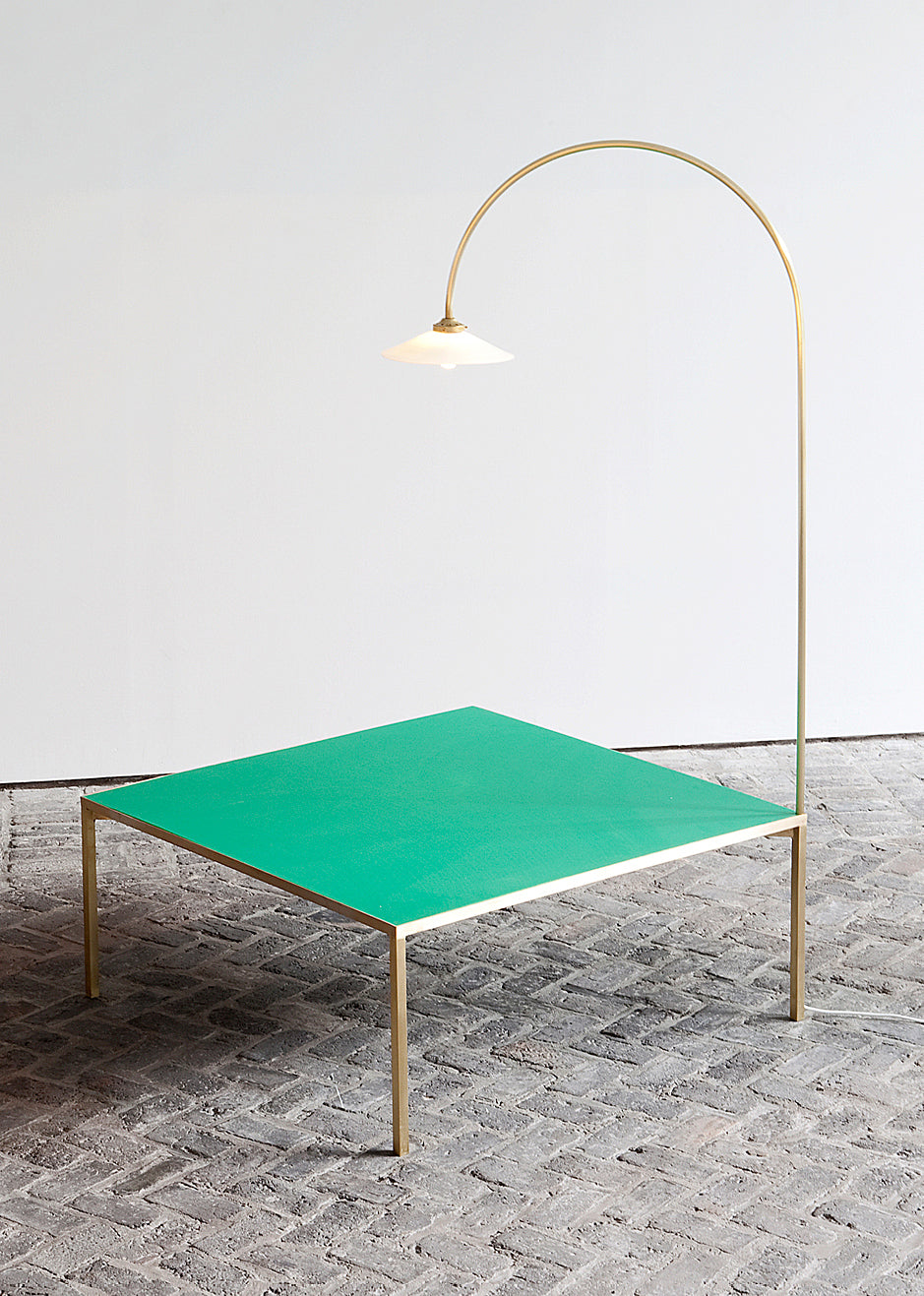 Low table + lamp features a polyethylene table top combined with a brass or white lacquered steel frame and a metal arc coming out of one of the table legs. The arc has an integrated lamp with a white opaline glass shade and can be rotated to cast light over each part of the table.