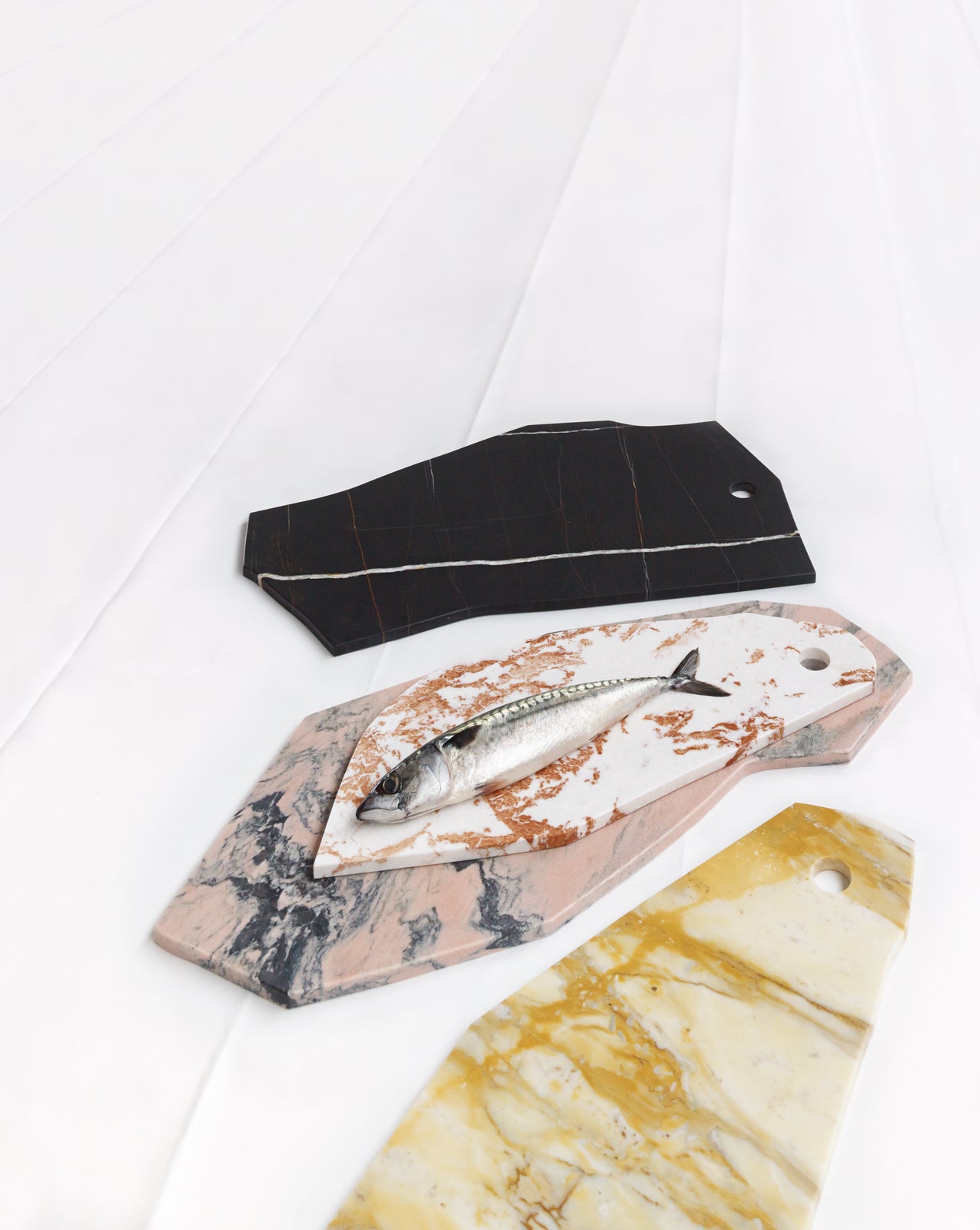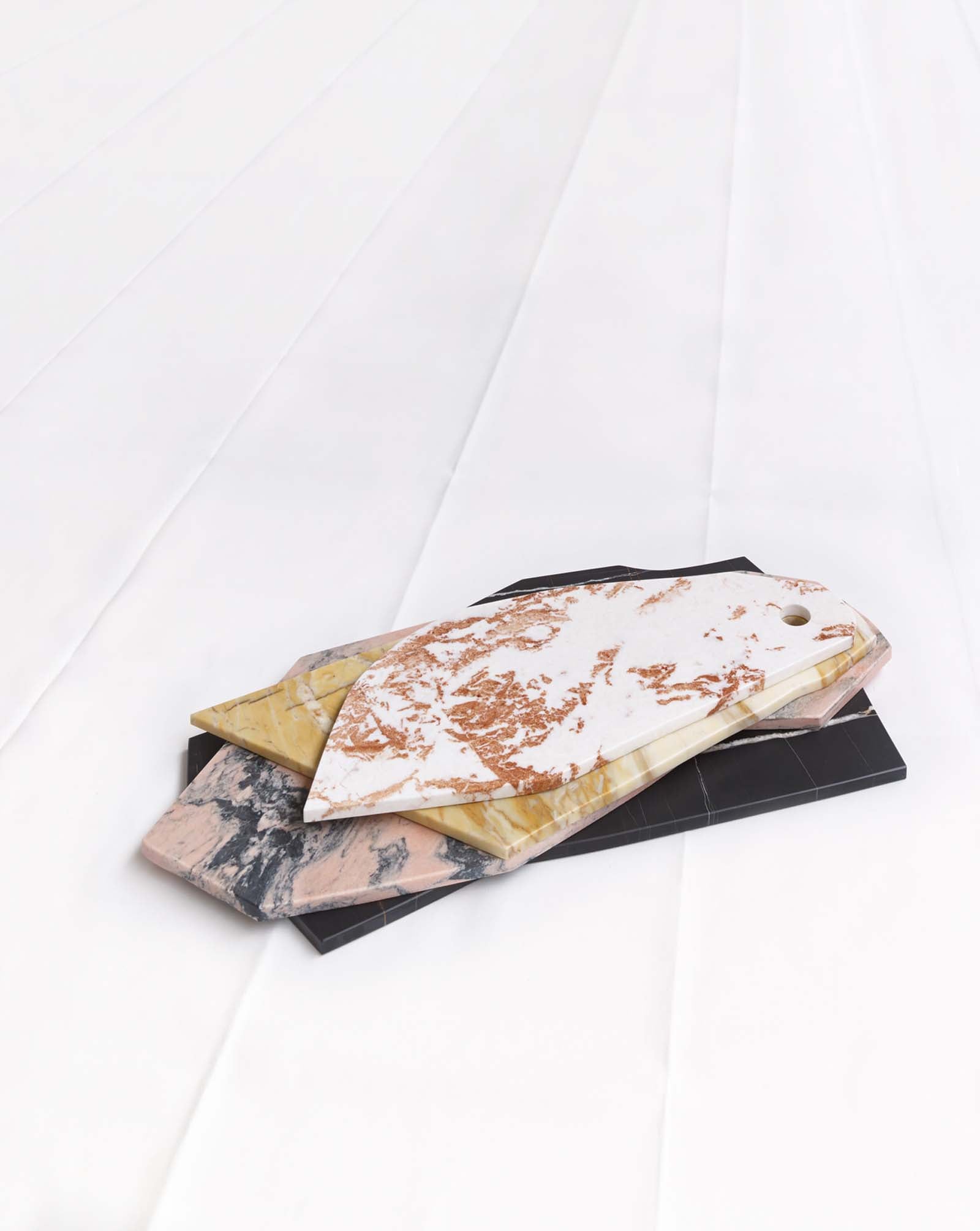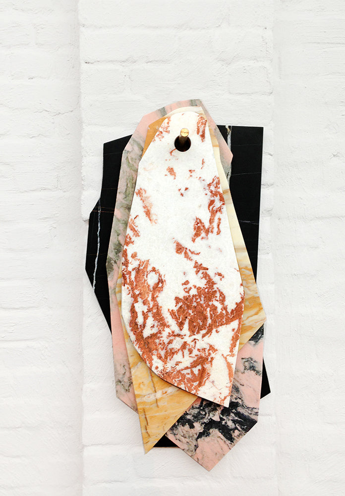 The cutting boards are a set of different kinds of marble, made to hang on a brass pin against the wall. The organic forms create a ‘bas relief’. Every plate has been meticulously shaped in order to create depth of field. When one board is taken away, the sculpture changes its appearance. Due to the nature of marble, the vein patterns and colors will vary on each set, making each piece unique.