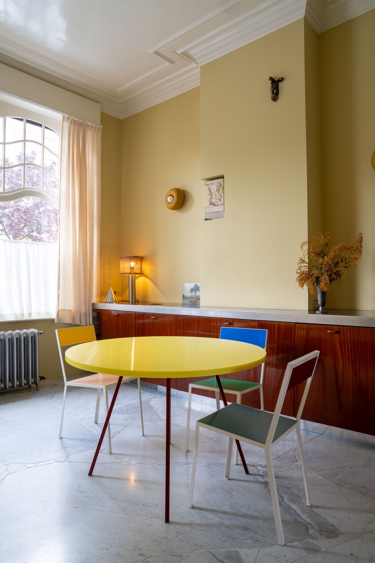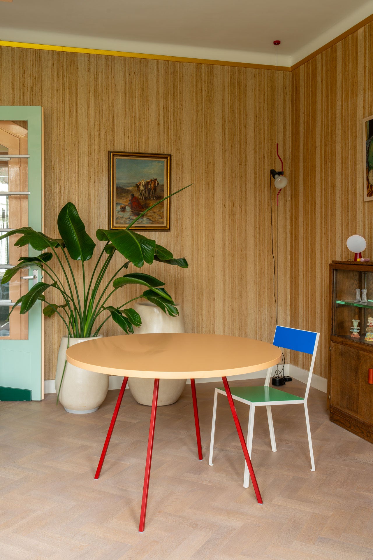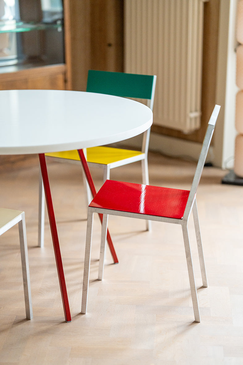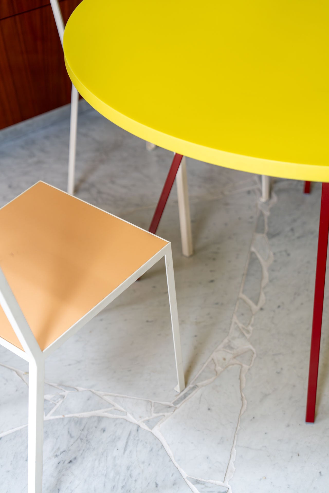 Round table is first shown at New Work, the second solo exhibition of Muller Van Severen at Valerie Traan Antwerp. Although the exhibition mainly consisted of glossy lacquer surfaces, it also presented three polyethylene tables mounted on rusted steel and red lacquered steel trestles.