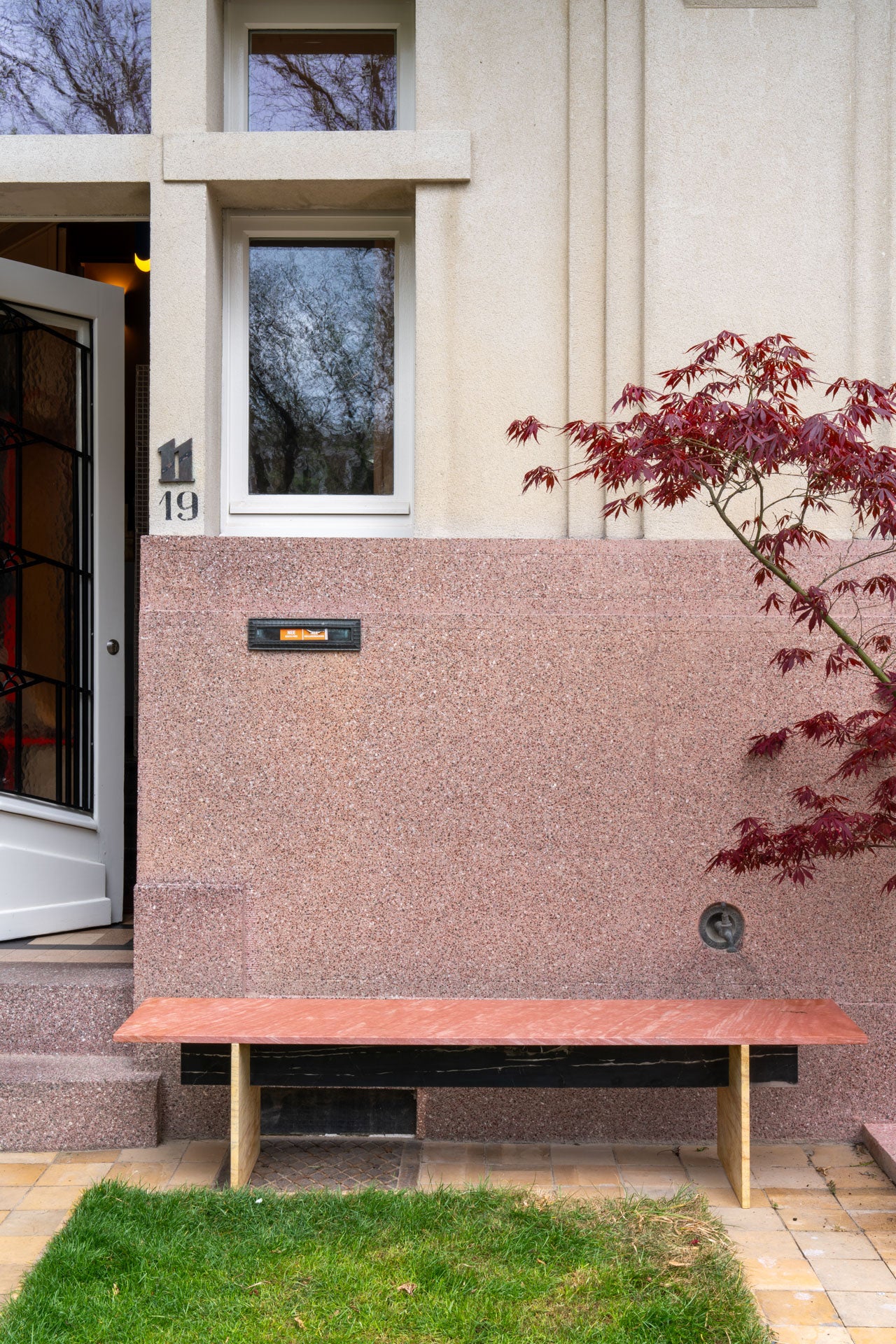 For this bench, different kinds of marble are combined creating a minimalistic object with astonishing color tones. In the middle an invisible steel plate is added to reinforce and support the fragile marble. Due to the nature of marble, the vein patterns and colors will vary on each bench, making each piece unique.