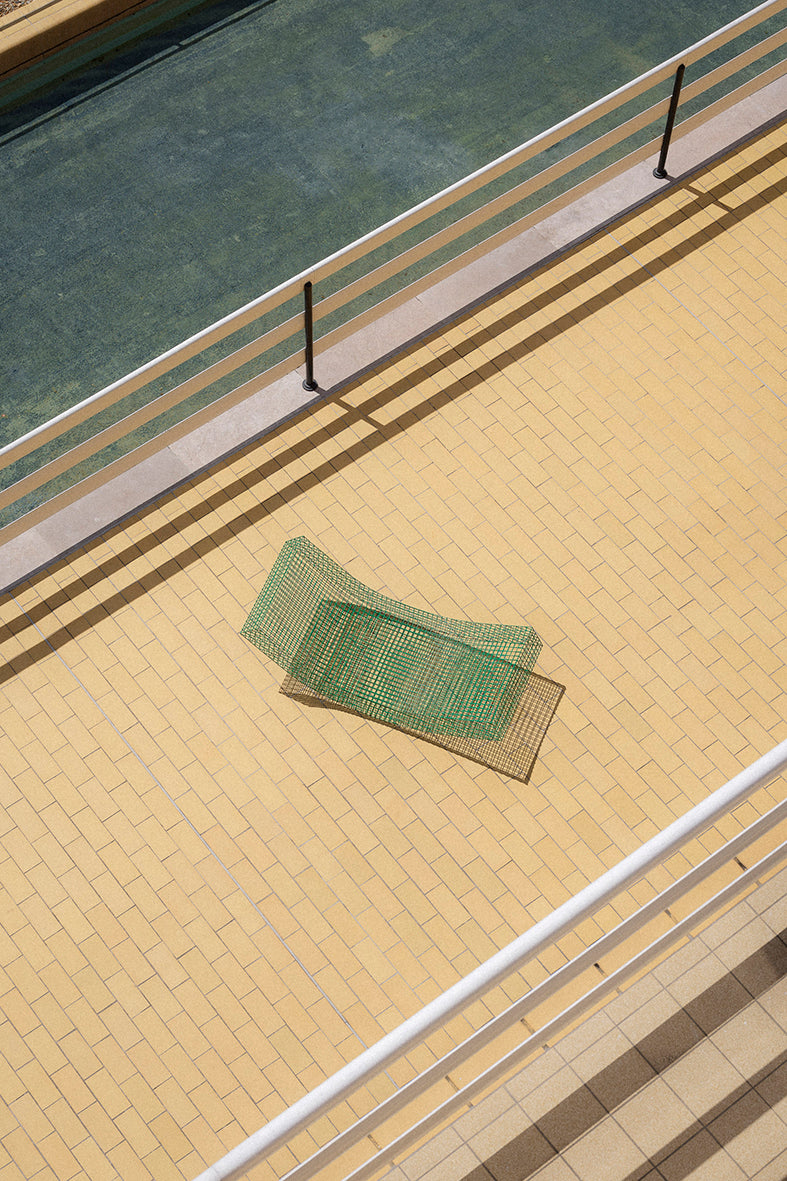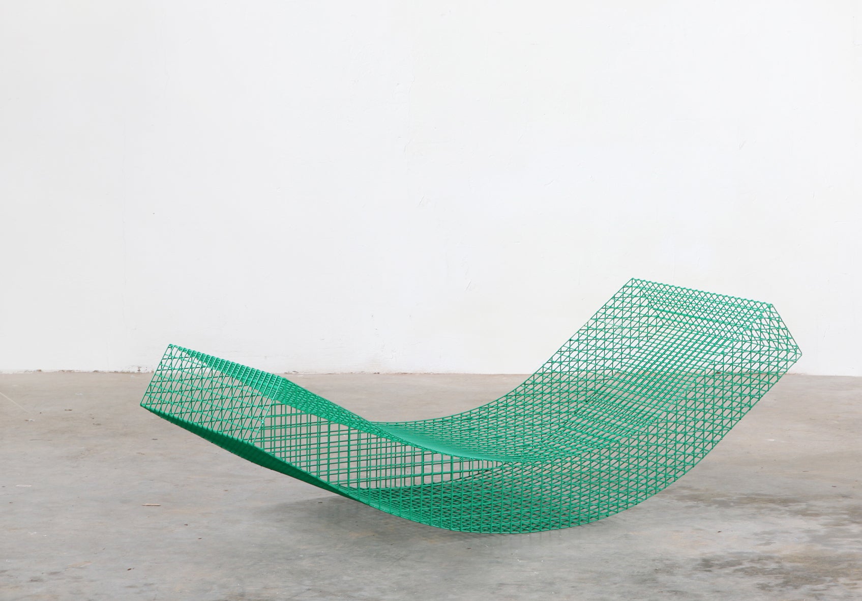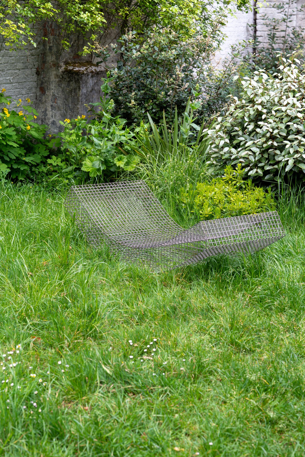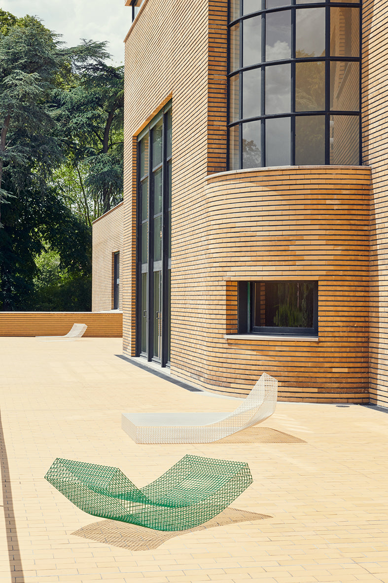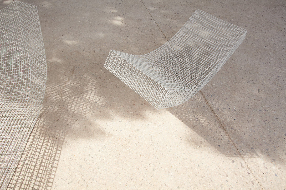 The sculptural seat, made of a lightweight grid in stainless steel, is looking like a mattress folded in different shapes. The wire S is made to lounge in either indoors or outdoors. It's available in stainless steel and powder stainless steel.