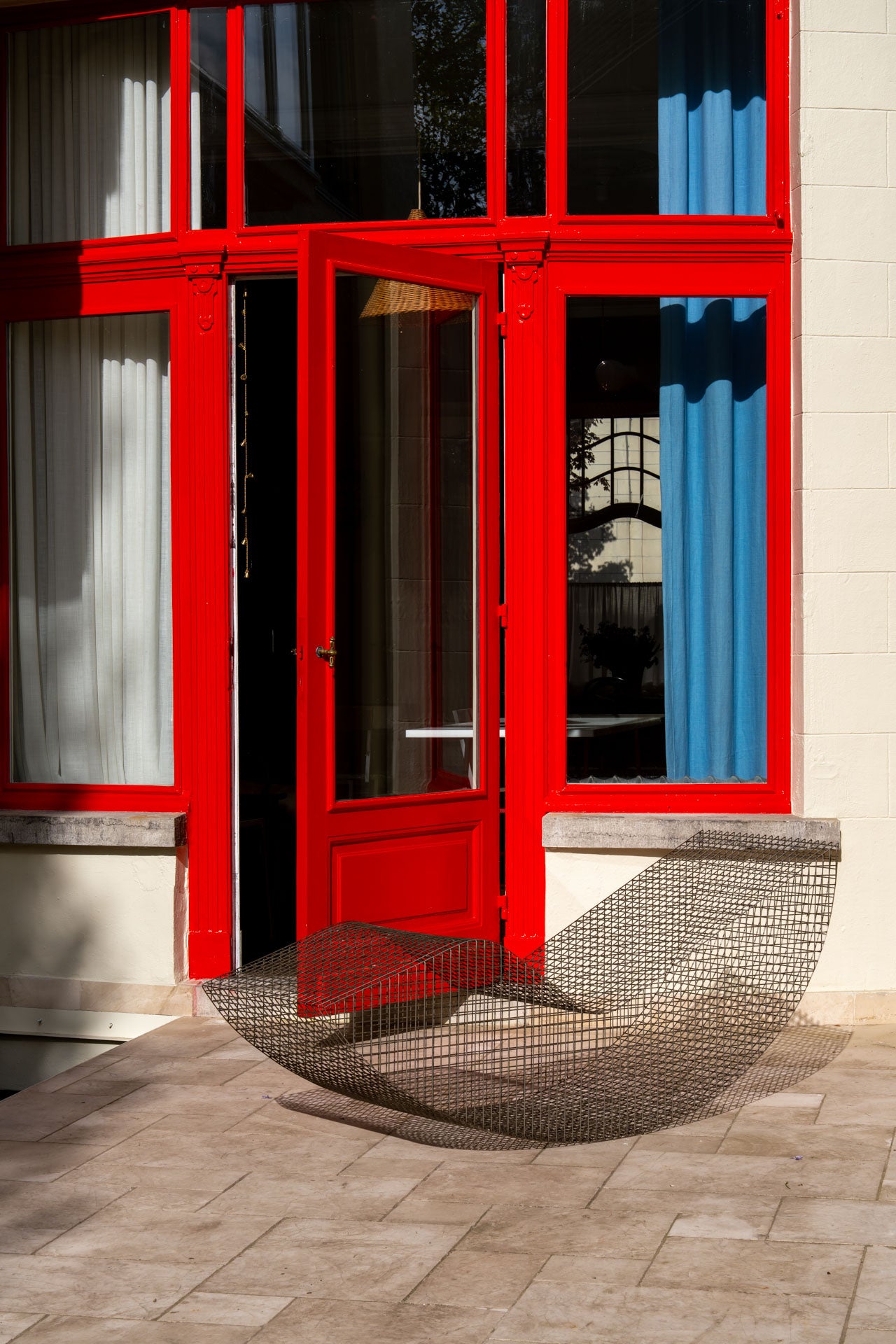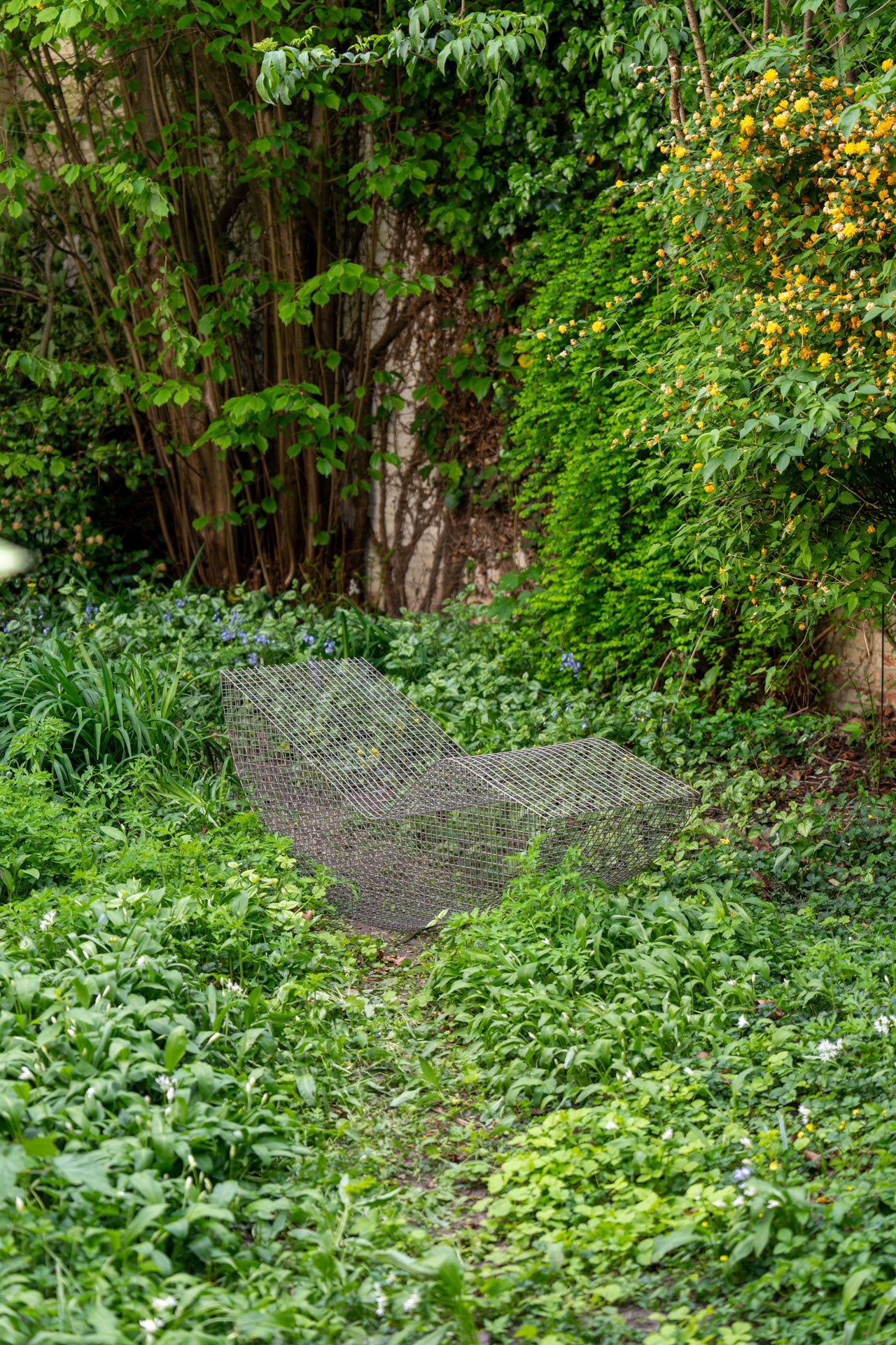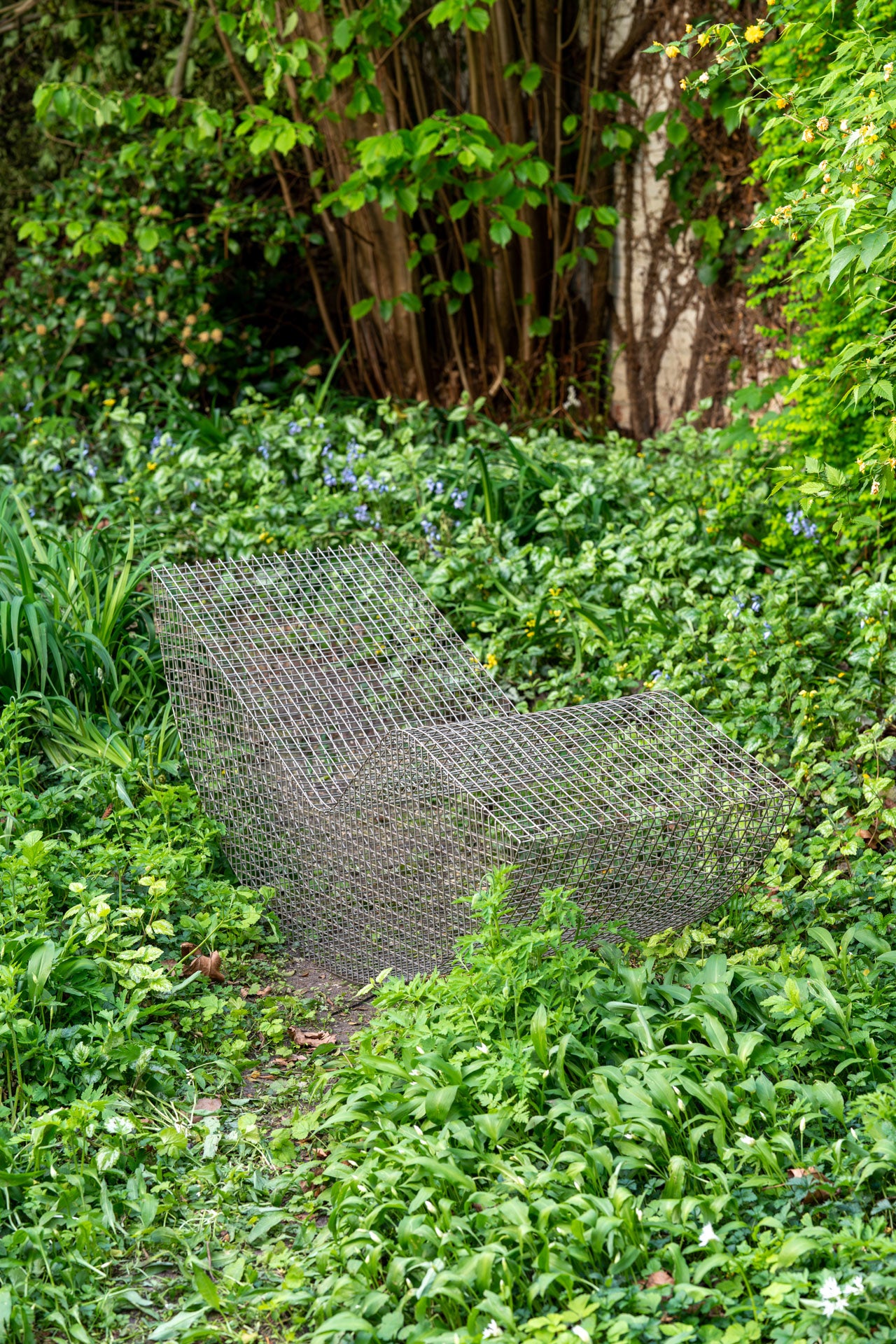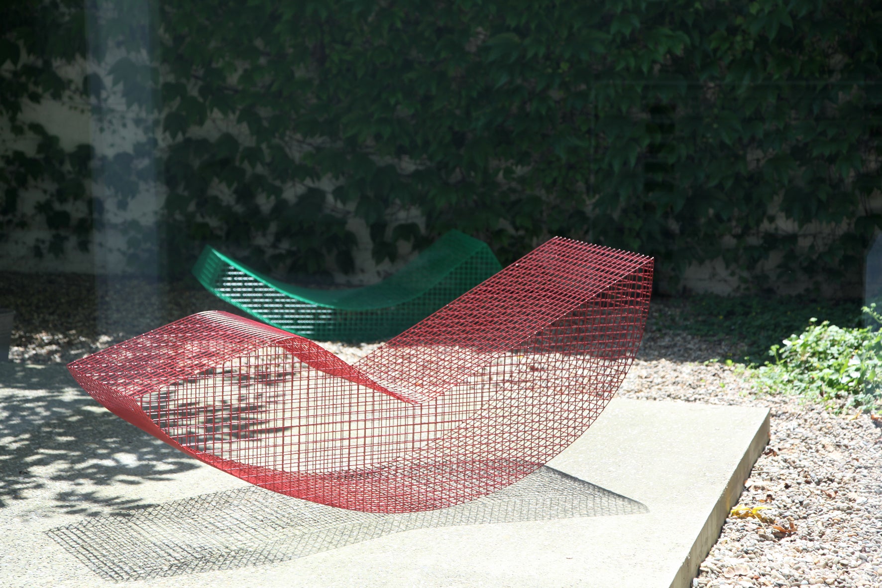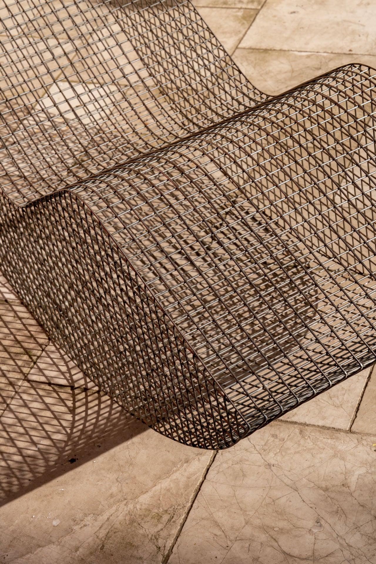 The sculptural seat, made of a lightweight grid in stainless steel, is looking like a mattress folded in different shapes. The wire S is made to lounge in, either indoors or outdoors. It's available in stainless steel and powder stainless steel.