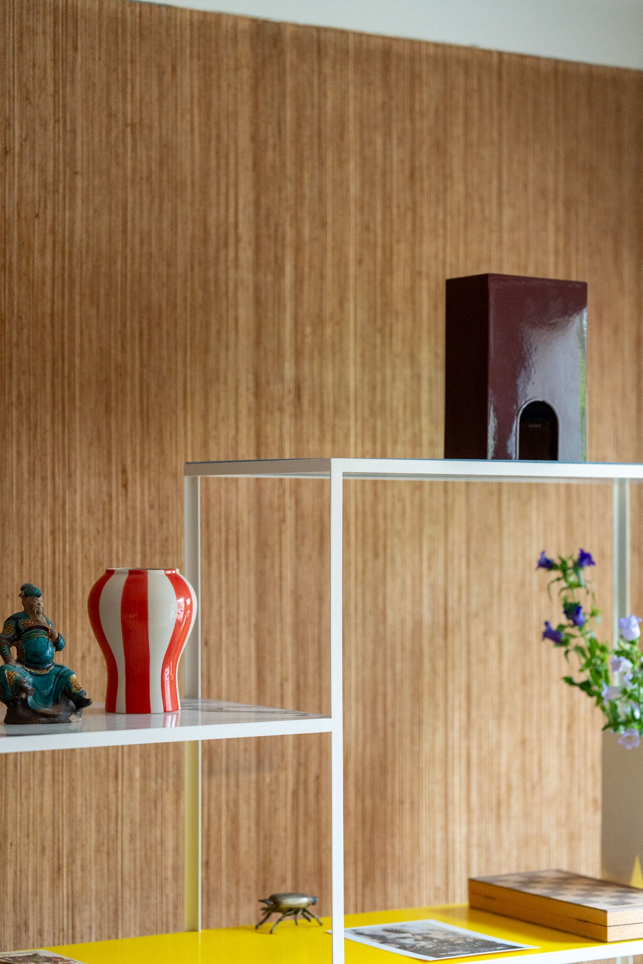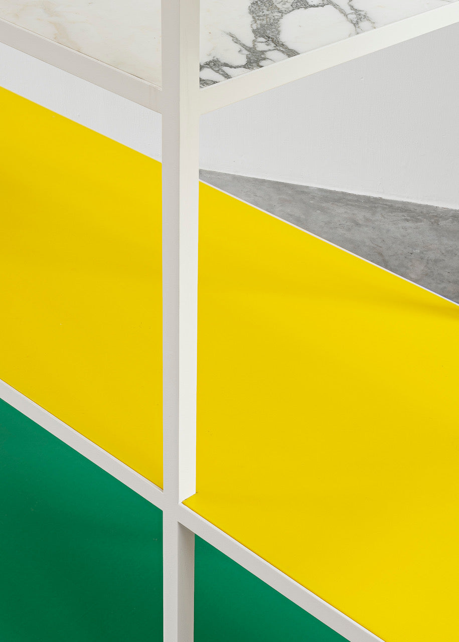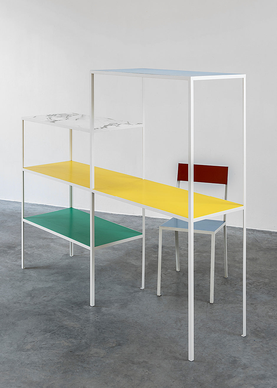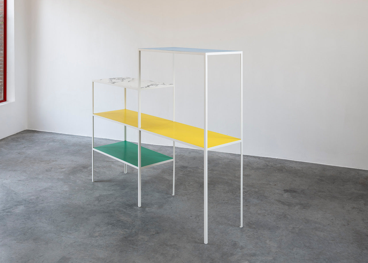 This one-piece desk and rack features a lightweight white lacquered steel frame, combining shelves in colorful polyethylene and marble, arranged at varying heights. Each color is thoughtfully selected: a bright yellow defining the largest surface, with light blue on top and green grounding the base, creating a playful yet balanced composition. Every surface is meticulously carved along the edges to ensure a precise, seamless fit within the steel structure.